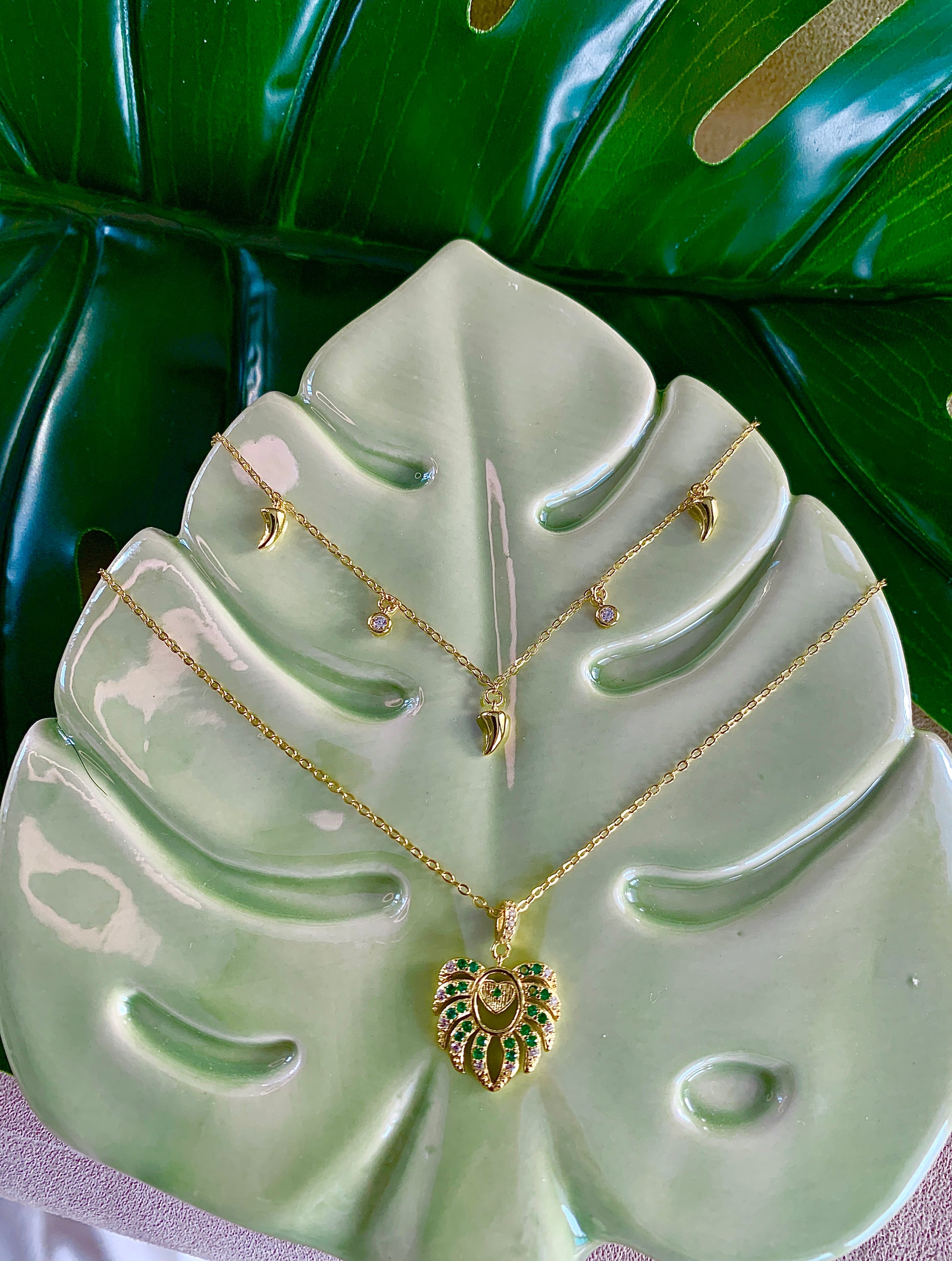 Dieses extravagante Schmuckstück besteht aus 2 Ketten und ist mit seinen exotischen Details ein echter Eyecatcher. Das Monsterra Blatt der längeren Kette ist mit funkelnden grünen Zirkonia Steinen bestückt, während die kürzere Kette mit mit Mini Horn Details und weißen Zirkonia Steinen verziert ist.